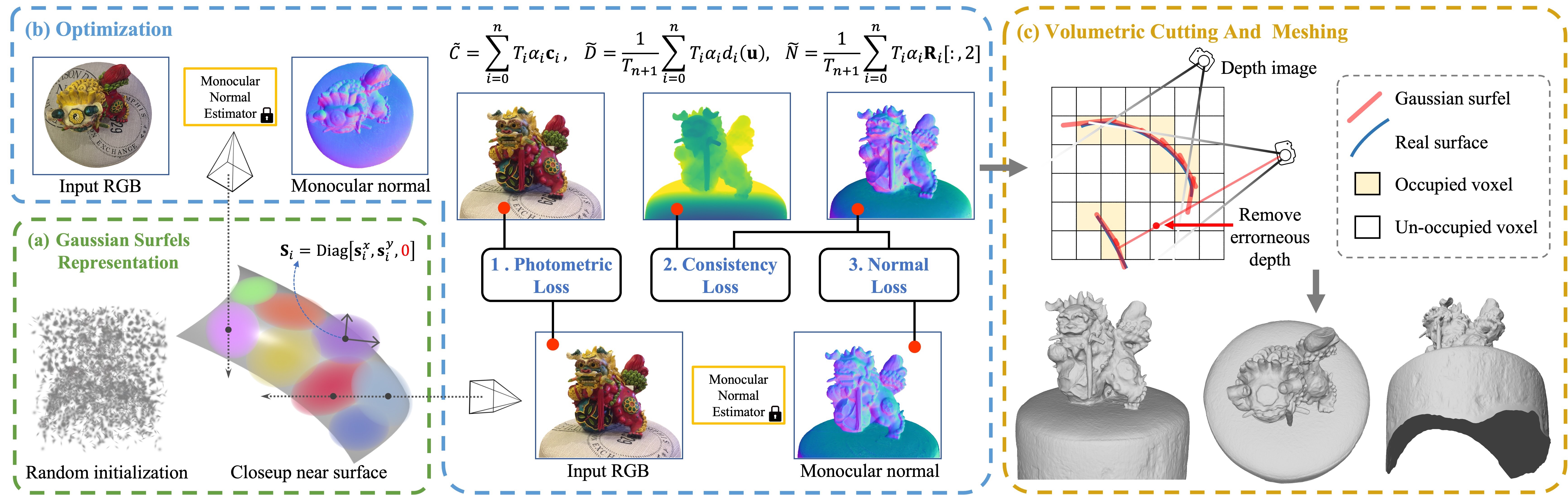 The pipeline of our method. Our method involves the following steps: (a) Starting with random initialization, our method represents the surface as a set of Gaussian surfels, each with learnable position, rotation, color, opacity, and covariance; (b) Optimize the Gaussian surfels through multi-view photometric loss, depth-normal consistency loss, and normal prior loss; (c) Perform volumetric cutting on rendered depth maps, then apply Poisson meshing from rendered depth and normal to extract a high-quality mesh. Our method can automatically obtain an open surface reconstruction result.